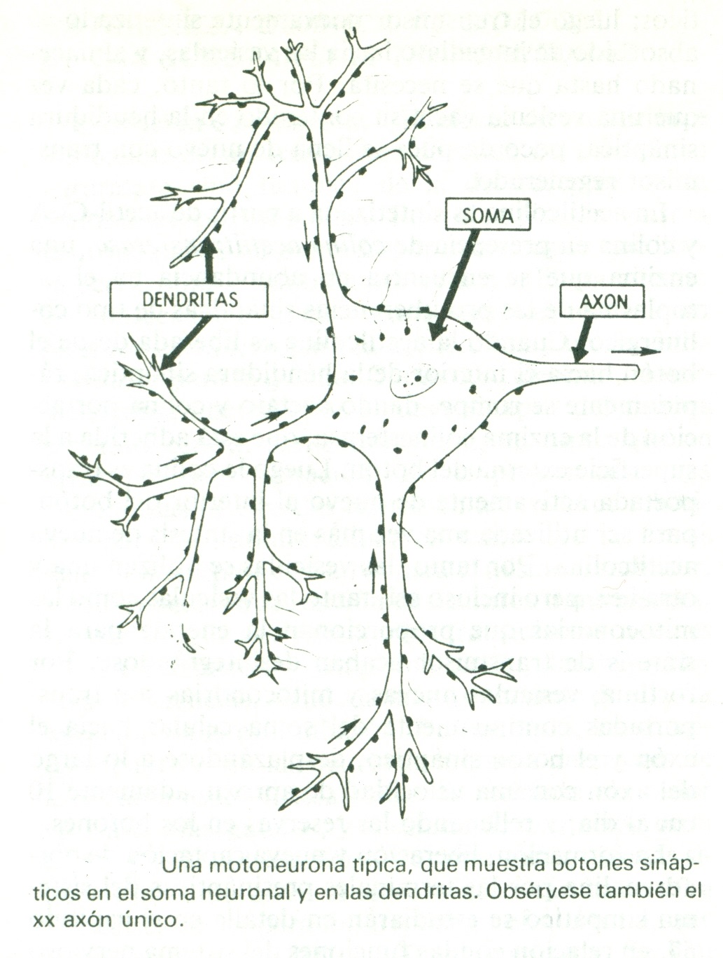 Las dendritas de las motoneuronas anteriores suelen extenderse de 500 a 1.000 μm en todas las direcciones a partir del soma neuronal, y pueden recibir señales procedentes de una gran región espacial en torno a la motoneurona. Esta característica ofrece enormes oportunidades para su sumación desde numerosas fibras nerviosas presinápticas independientes. La mayoría de las dendritas no son capaces de transmitir potenciales de acción, pero sí señales dentro de la misma neurona mediante conducción electrotónica. Relación del estado de excitación de la neurona con la frecuencia de descarga. El «estado excitador» es el nivel acumulado de impulsos excitadores en la neurona. Si en un momento determinado el grado de excitación es más alto que el de inhibición, entonces se dice que existe un estado excitador. A la inversa, si es mayor la inhibición que la excitación, lo que se dice es que hay un estado inhibidor. Cuando el estado excitador de una neurona sube por encima del umbral de excitación, la célula disparará de forma repetida mientras permanezca a ese nivel